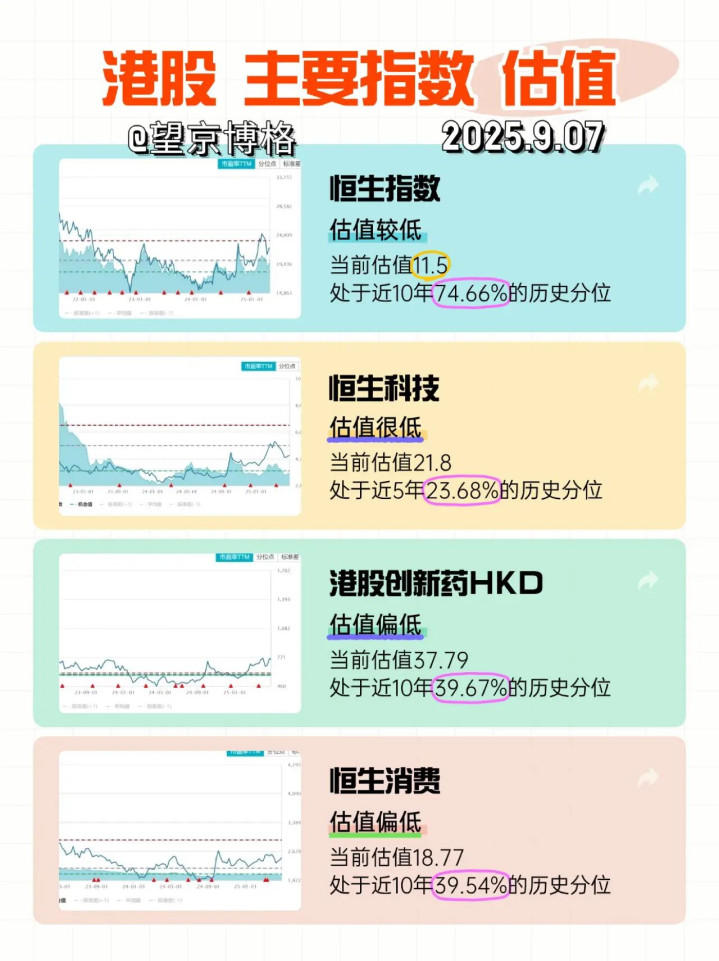 目前大部分指数的估值与上周五收盘时相差不大。值得一提的是恒生消费指数,其估值仅微升0.04倍(从18.73升至18.77),但估值分位却上升了近20%。这主要是因为该指数的估值多集中在18倍左右,因此稍有波动,历史分位就会发生较大变化。目前恒生消费的估值仍处于合理偏低水平,大家不必过于担忧。