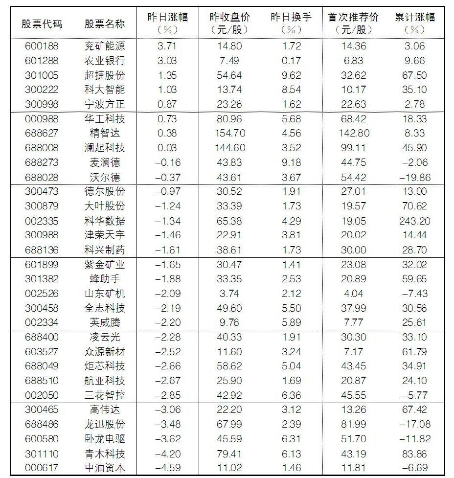 大众30指数成份股中,16日涨幅前五位的分别是兖矿能源、农业银行、超捷股份、科大智能、宁波方正,涨幅分别为3.71%、3.03%、1.35%、1.03%、0.87%;跌幅榜上,中油资本、青木科技、卧龙电驱、龙迅股份等跌幅居前。